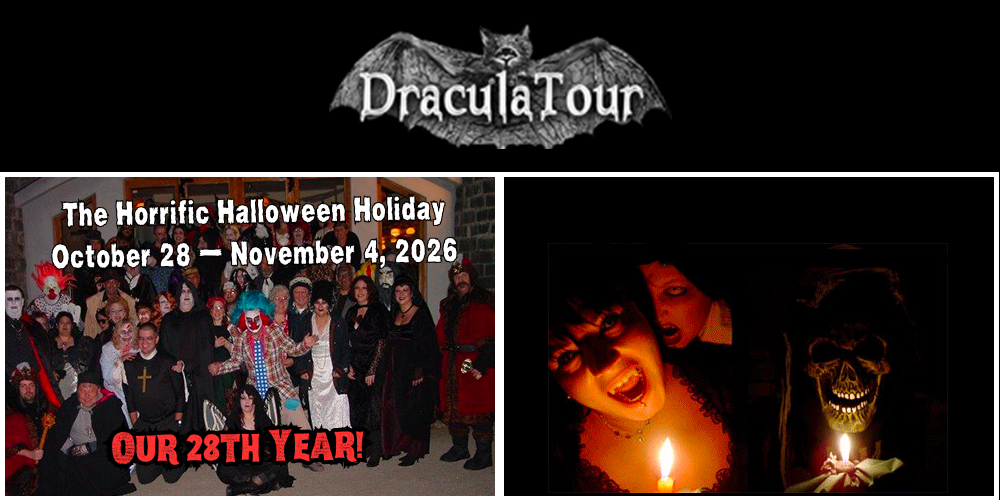 Dracula Tour follows Jonathan Harker's trail from the Bram Stoker novel "Dracula," and for over 20 years one of the many highlights was the group spending a night at Dracula's Castle with a gala Halloween-style masquerade ball. This journey to Vlad's land is both entertaining and informative, revealing the history and the myths, but most of all, all the fun. Tour package includes round-trip airfare, transfers, luxury coach transportation, deluxe hotel accommodations, all breakfasts, full-course dinners, plus all attractions, events, parties, banquets, guests and entertainment. DracTours are presented and hosted by Dracula fans for fellow fans. Rated #1 by vampire fans and endorsed by the Romanian Tourism Board.